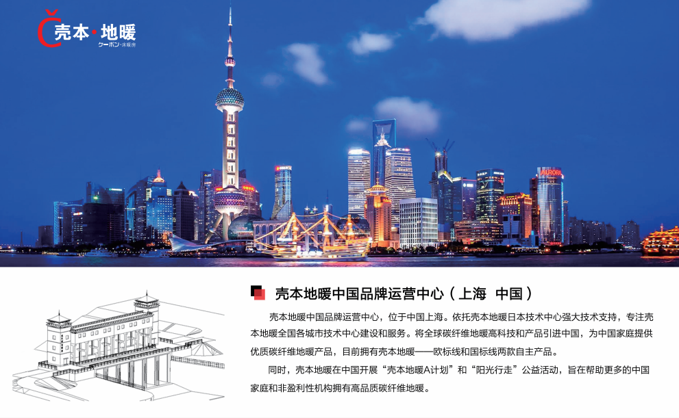 殼本地暖——中國品牌運營中心位于上海,負責殼本碳纖維地暖在中國的品牌運營和售后服務職責。致力于建設殼本碳纖維地暖中國區域各地城市技術服務中心。殼本地暖秉持“用科技武裝產品,用禪意貫徹服務”的理念。致力于提供行業前沿的科技產品、打造舒適系統的服務平臺、倡導和發起舒適行業內專項公益事業。客戶已涉及30個行業類別,其中包括中國軍工、地產、工程、學校、 居家采暖等。